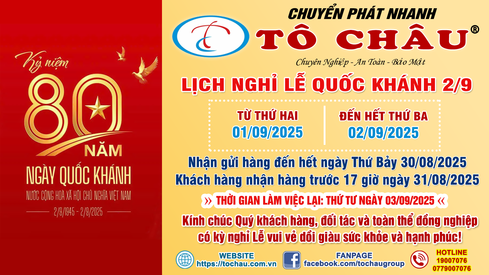 🗓 Thời gian nghỉ lễ: Từ Thứ Hai, 01/09/2025 đến hết Thứ Ba, 02/09/2025